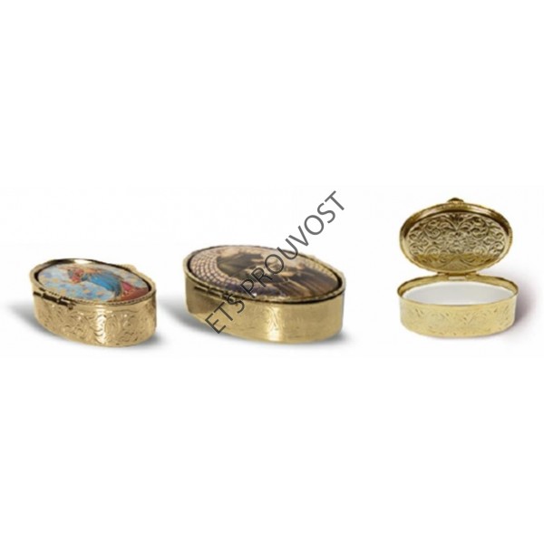 Détail du produit : Boite à pilule illustrée de Ste Rita - finition dorée et émaillée. Taille 6.5cm.