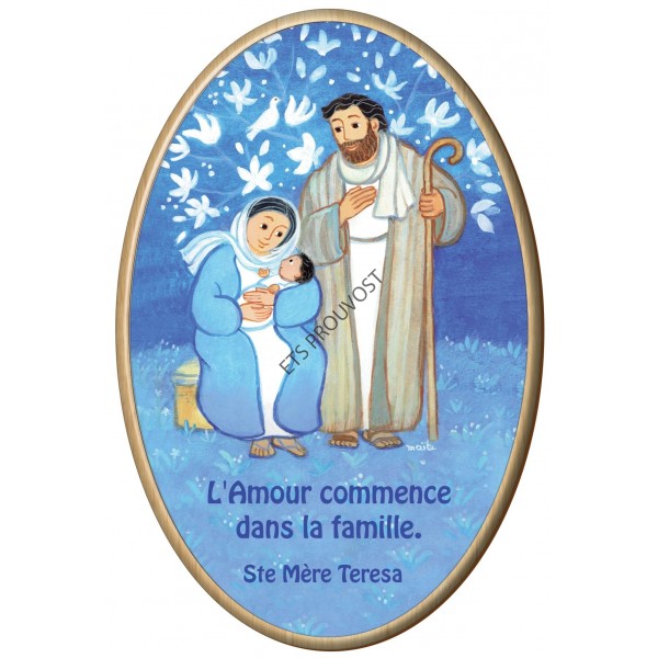 Cadre en bois avec impression. Format 15x10cm. Fourniture sous blister avec accroche métal murale. Illustration exclusive de Maïte Roche pour ce produit - Sainte Famille couleur .